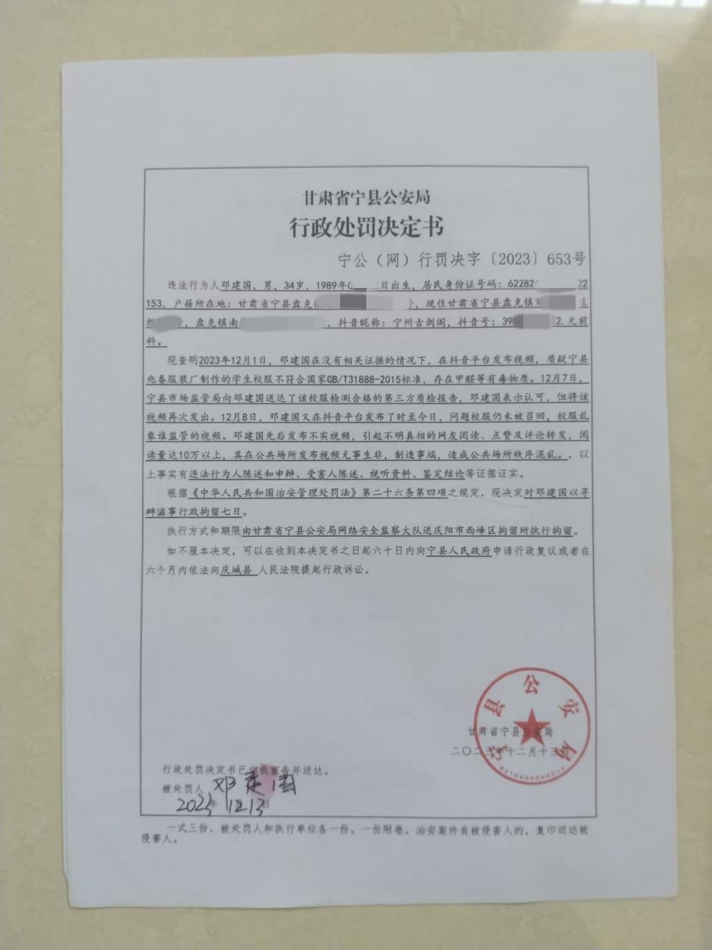2023年12月,甘肃庆阳市宁县盘克镇36岁男子邓建国因在网上反映儿子校服存在质量问题,校服厂商报案后,遭宁县公安局网络安全监察大队以寻衅滋事为由行政拘留7天。