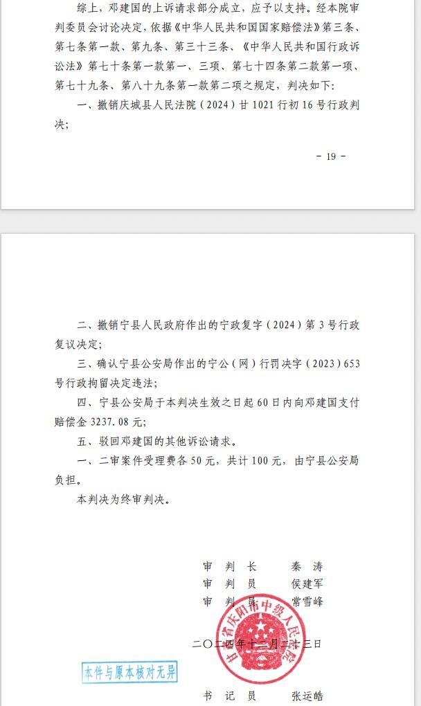 被拘留后,邓建国精神状态急剧恶化,不仅导致夫妻感情破裂、婚姻解体,还被工作单位辞退,更被诊断出患有抑郁症。2024年1月10日,邓建国向宁县人民政府申请行政复议,却收到维持原处罚的决定;他随后向庆城县人民法院提起行政诉讼,将宁县政府、宁县公安局告上法庭,2024年7月11日其诉讼请求被驳回。不服一审判决的邓建国继续向庆阳市中院提起上诉。