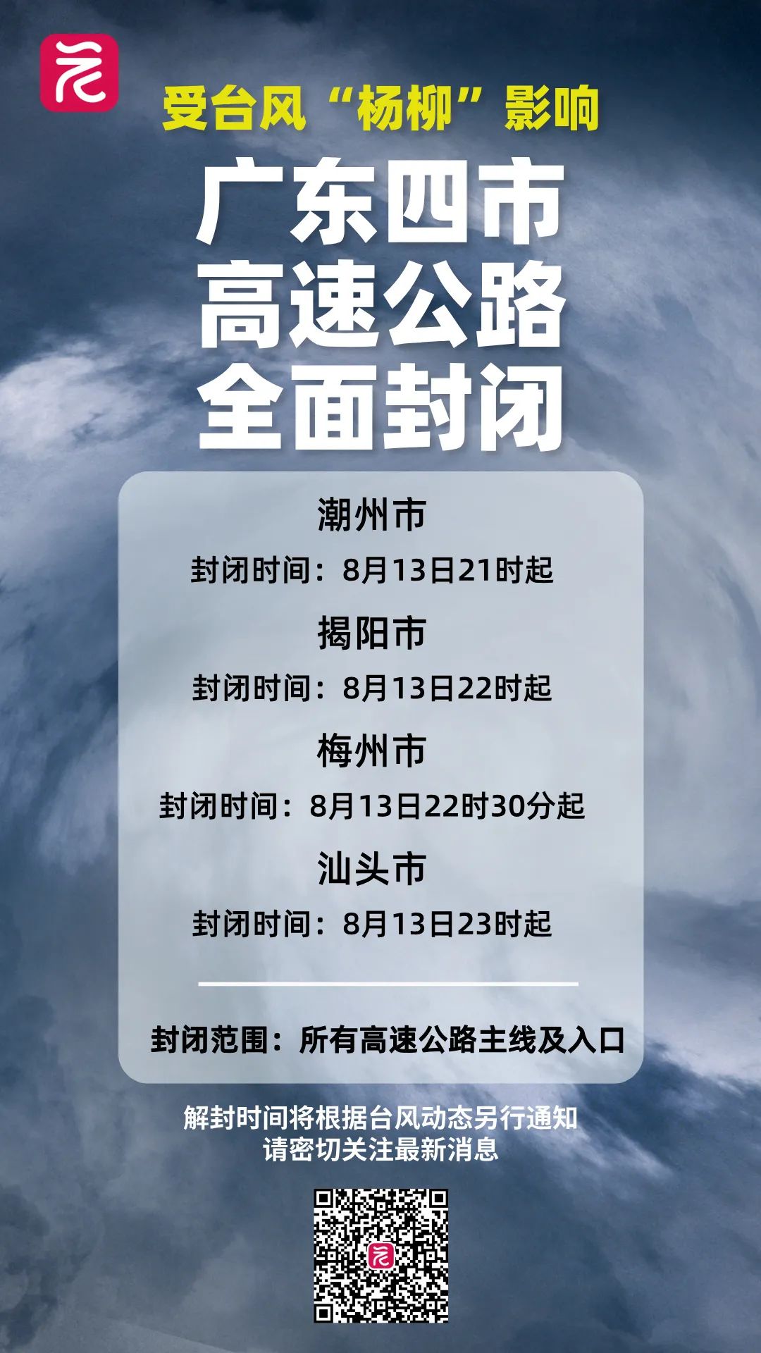 记者获悉, 8月13日晚,广东潮州、揭阳、梅州和汕头四市先后发布通告称,受今年第11号台风“杨柳”影响,为保障群众出行安全,决定对高速公路进行临时交通管制。