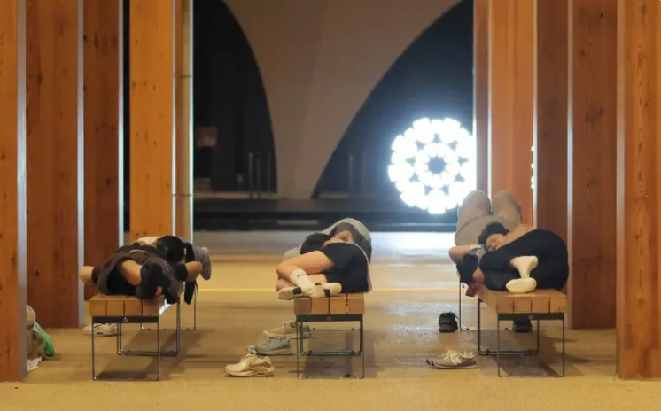 △被困在大阪世博会场的游客只能躺在长椅上休息。