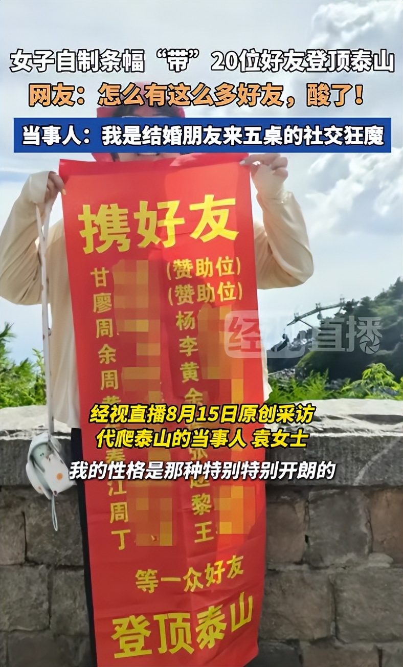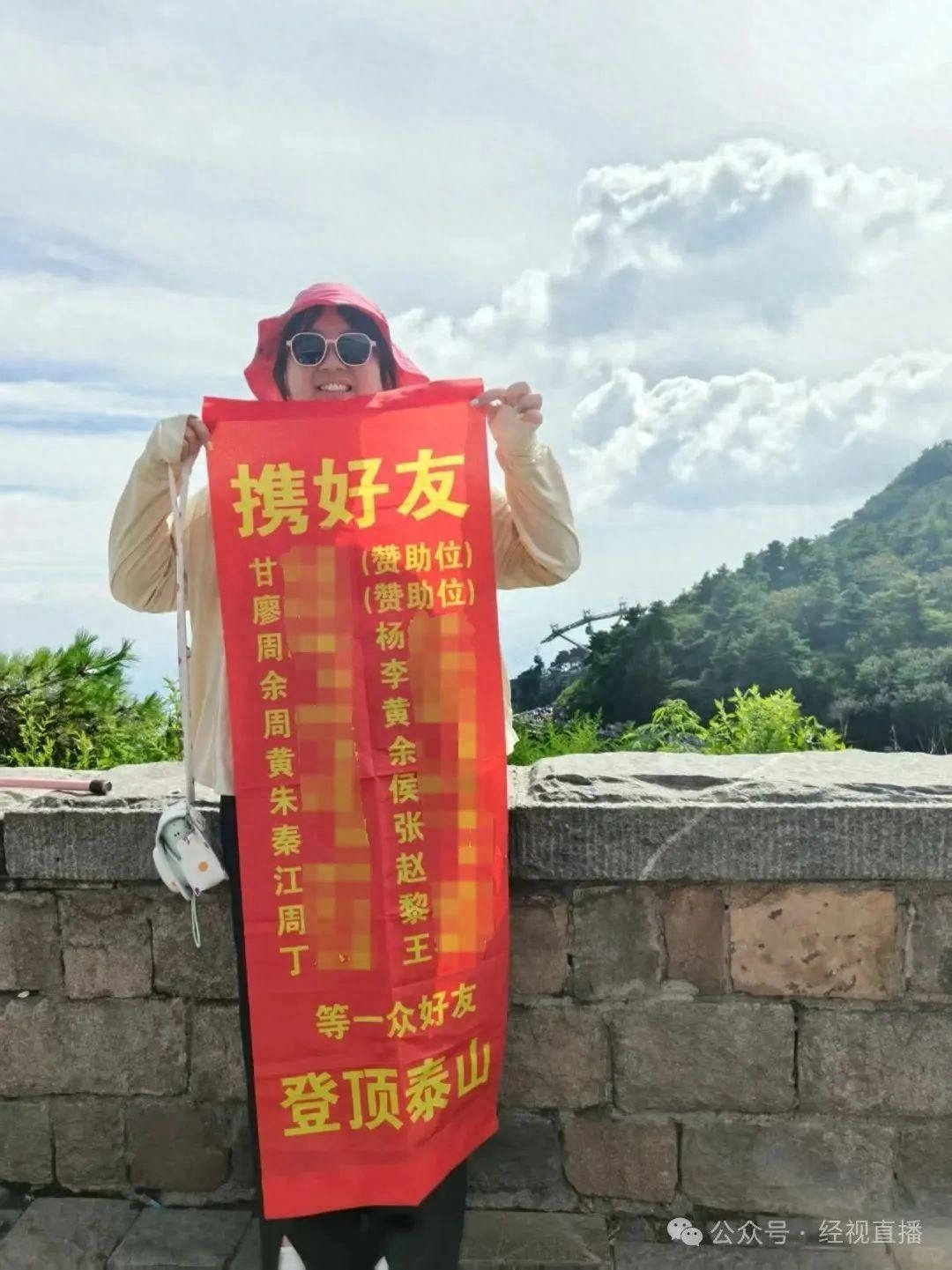 该网友发布的照片显示,一位女士手持条幅在泰山留影,条幅上印着 20 位好友的名字,标注“携一众好友登顶泰山”,其中两名好友的名字位于所有名字之首,特别注明为“赞助位”。
