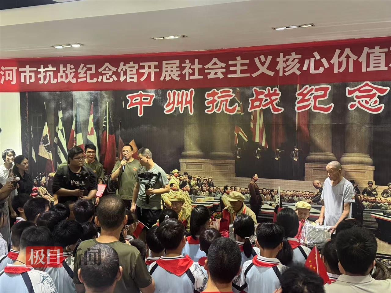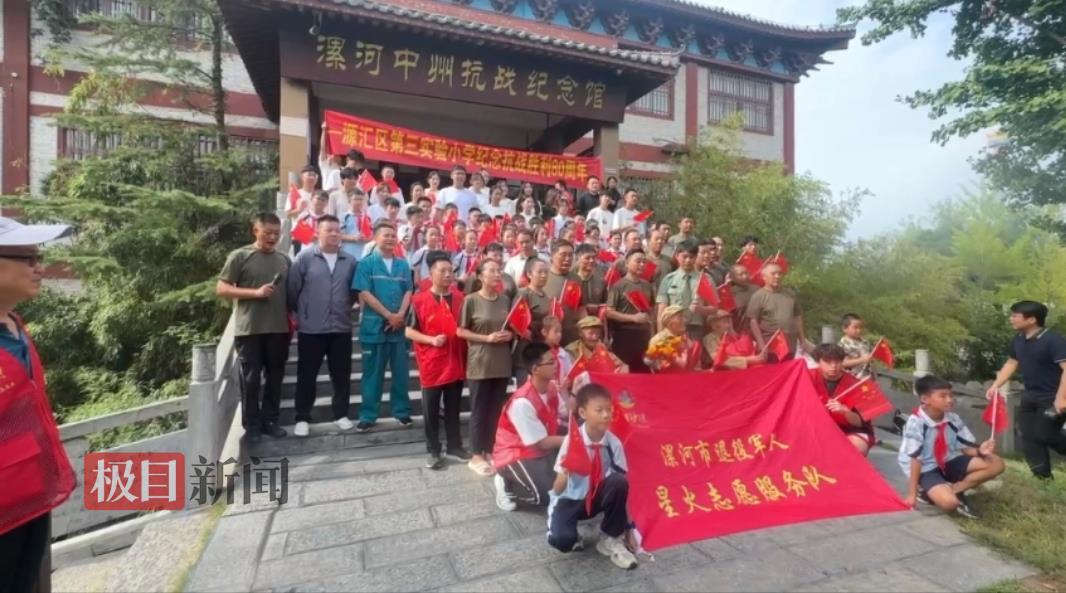 除了受降路,8月15日上午,三位抗战老兵、漯河当地的学生及市民等,还来到漯河中州抗战纪念馆,重温那段历史岁月,在场的小学生代表给抗战老兵们敬礼送花。