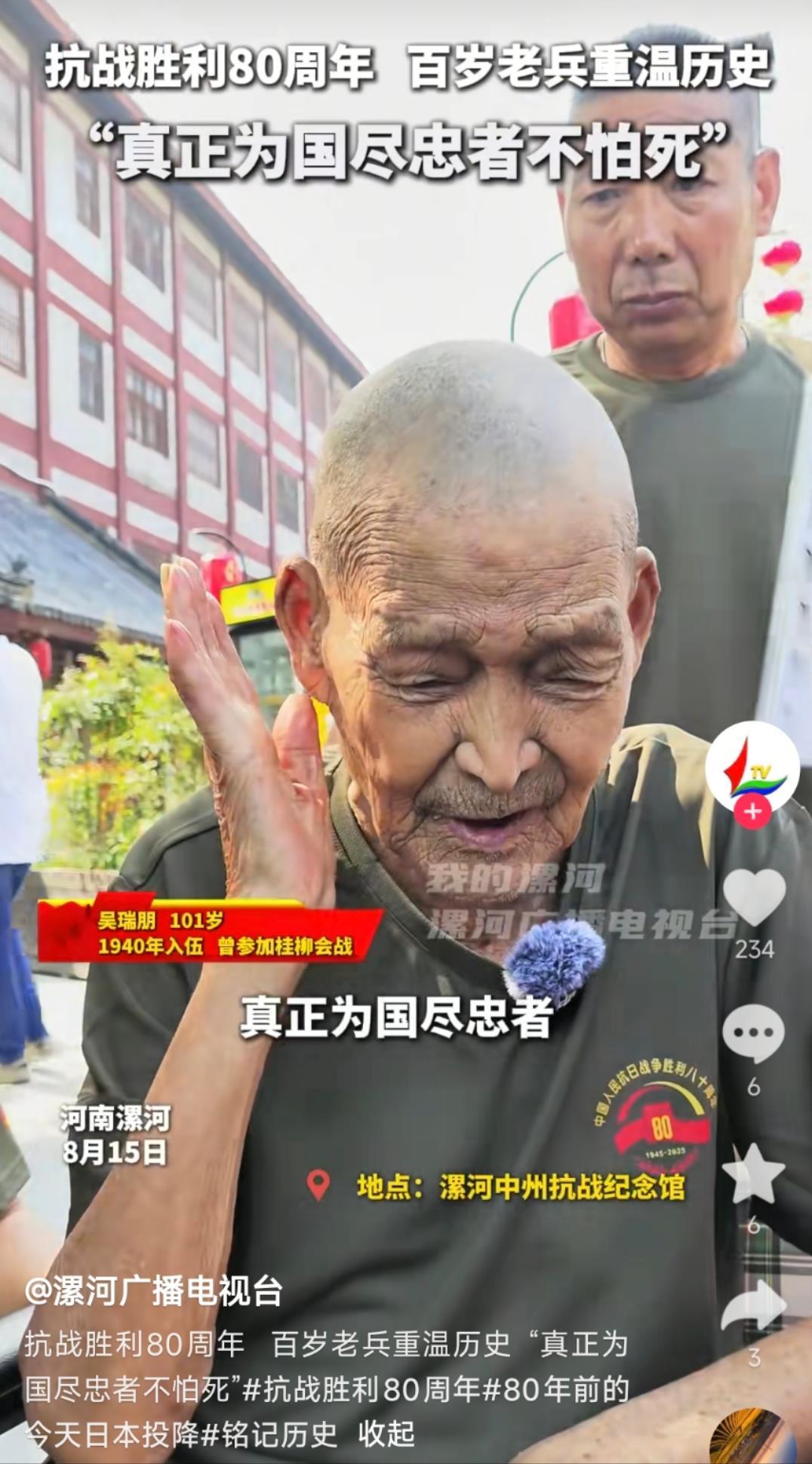 “真正为国尽忠者不怕死!”曾参加桂柳会战的101岁抗战老兵吴瑞朋铿锵有力地说道。