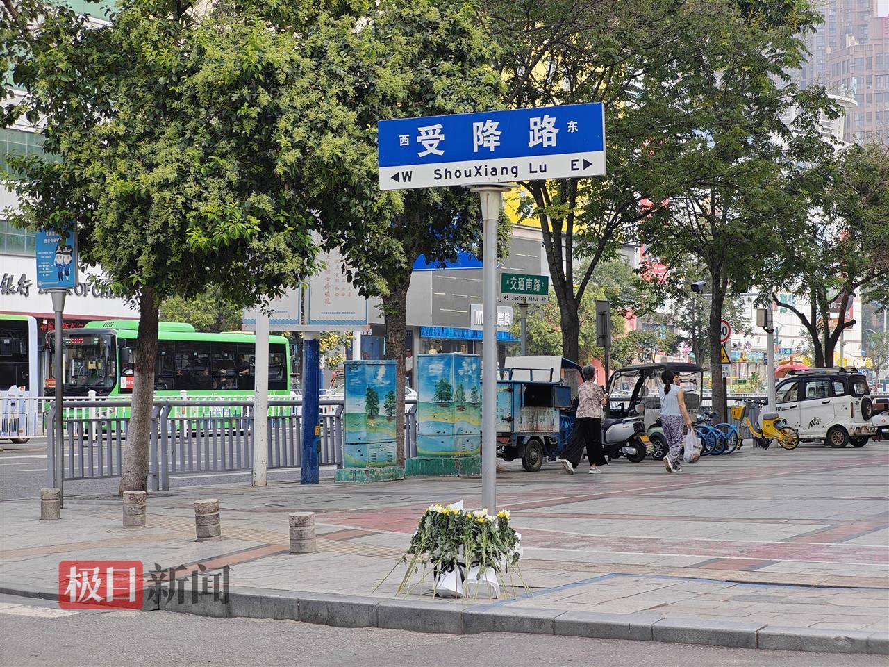 受降路路口已被摆上菊花(极目新闻记者拍摄)