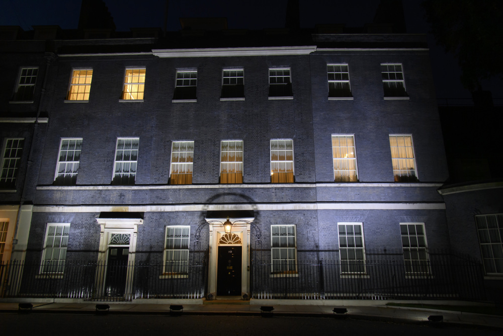 8月15日,位于英国伦敦的唐宁街10号首相府被点亮。 新华社发(雷伊·唐摄)