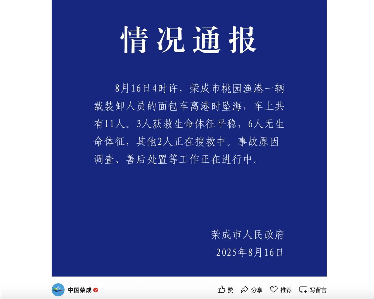8月16日凌晨4时许,山东省荣成市桃园渔港一辆载装卸人员的面包车离港时坠海,车上共有11人。3人获救生命体征平稳,6人无生命体征,其他2人正在搜救中。极目新闻记者采访了解到,目前当地正处于休渔期。不过,渔港附近有商户告诉极目新闻记者,近期在进行鱿鱼专项捕捞。