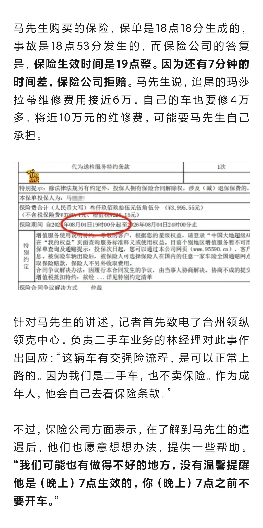 马先生说,他的车险费用是3995元,当天18点16分生成的保单,过了十几分钟,马先生开车回家,没想到,在路上追尾了,撞的还是一辆玛莎拉蒂。事故发生后,马先生联系了保险公司,可理赔却出意外了。