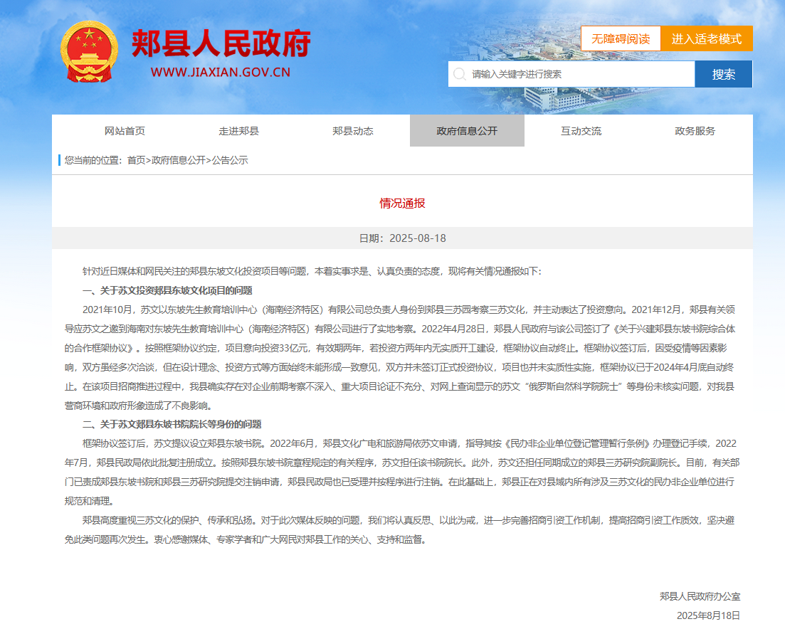 郏县高度重视三苏文化的保护、传承和弘扬。对于此次媒体反映的问题,我们将认真反思、以此为戒,进一步完善招商引资工作机制,提高招商引资工作质效,坚决避免此类问题再次发生。衷心感谢媒体、专家学者和广大网民对郏县工作的关心、支持和监督。