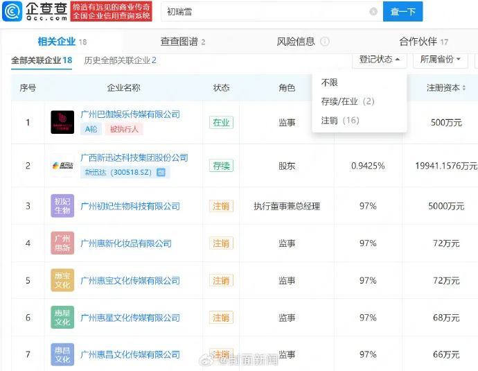企查查APP显示,初瑞雪名下关联18家企业,目前仅2家企业处于存续状态,分别是广西新迅达科技集团股份公司、广州巴伽娱乐传媒有限公司,其余16家企业均已注销。值得一提的是ZUZU品牌关联公司广州颐惠圆商贸有限公司也已于2021年3月注销。