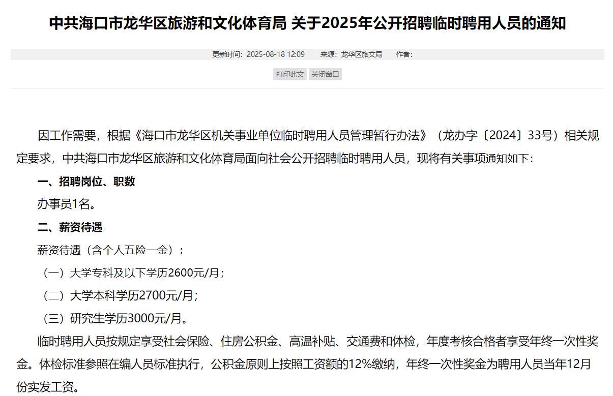 海口市龙华区人民政府网站8月18日发布《海口市龙华区资金与资产服务中心关于2025年公开招聘临时聘用人员的公告》和《中共海口市龙华区旅游和文化体育局关于2025年公开招聘临时聘用人员的通知》。薪资待遇含个人缴纳五险一金,本科生都是2700月/月,研究生3000元/月。8月11日,该网站发布了《海口市龙华区发展和改革委员会关于2025年公开招聘临时聘用人员的公告》,今年6月,该网站发布《海口市龙华区龙桥镇人民政府关于2025年公开招聘临时聘用人员的公告》,也是同样的月薪。