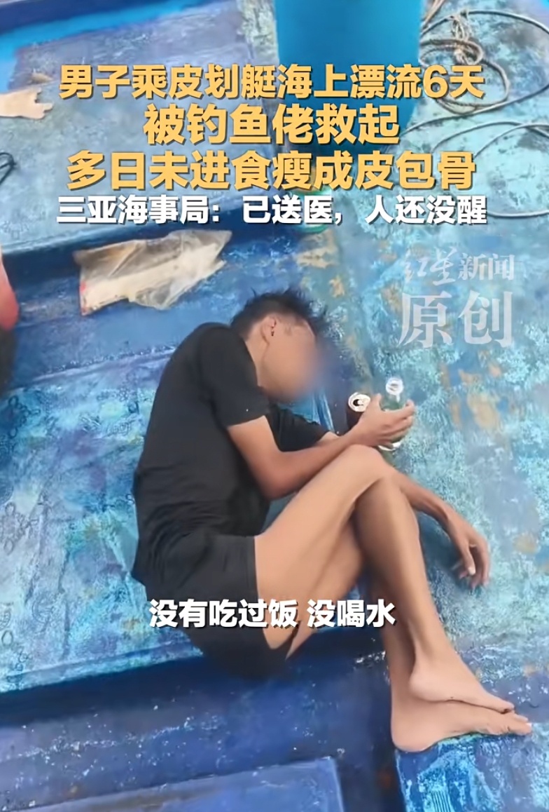 据这名男子自述,自己已经在海上漂流6天,除了他躺着的一艘皮划艇之外,没有其他东西。这名男子多日未进食,处于虚脱状态,人已瘦成皮包骨,救人者报警并将其送往医院治疗。