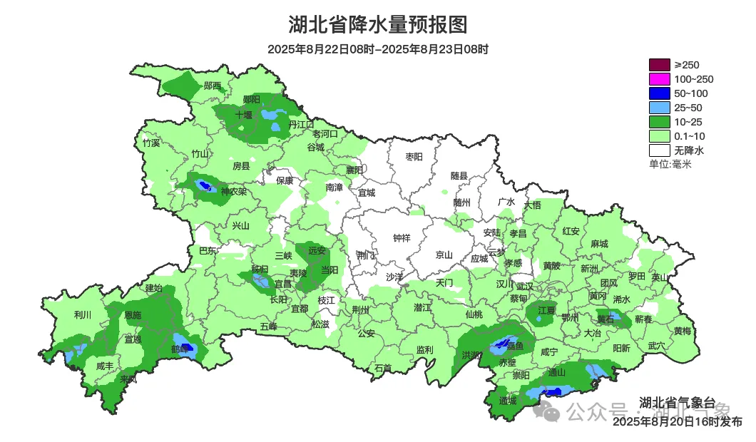 8月22日08时-23日08时,全省多云有分散性阵雨或雷阵雨,局地大雨或暴雨。省内局地有雷暴大风等强对流天气。最高气温恩施地区27~32℃、其他地区32~36℃,最低气温22~27℃,偏南风3级、阵风4到6级。
