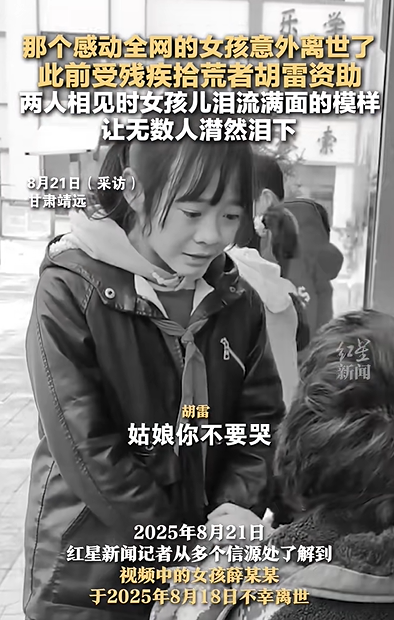 8月21日,红星新闻记者从多个信源处了解到,视频中的女孩薛某某于2025年8月18日不幸离世。胡雷告诉红星新闻记者,他每个月都会定时捐助这名女孩,他也是这两天得知了消息,内心十分悲痛。