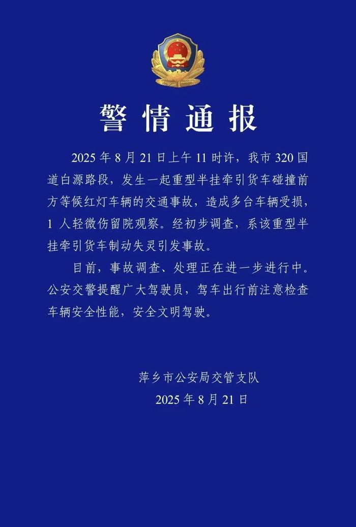 8月21日,江西萍乡市公安局交管支队通报:8月21日上午11时许,萍乡市320国道白源路段,发生一起重型半挂牵引货车碰撞前方等候红灯车辆的交通事故,造成多台车辆受损,1人轻微伤留院观察。经初步调查,系该重型半挂牵引货车制动失灵引发事故。目前,事故调查、处理正在进一步进行中。