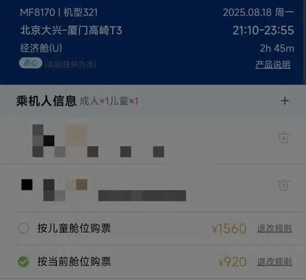 在国内某主流航空公司官网,记者也随机挑选多条热门航线进行搜索看到,多数航司直接为儿童提供了成人折扣票;有的则为儿童提供儿童舱位票和成人舱位票两种选择,在这种情况下,儿童票价普遍高于成人票。例如,8月18日从北京到厦门的某航班,成人折扣票为920元,约为3折,儿童票价格则达1560元。