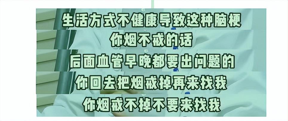 一位34岁的男性患者得了脑梗之后依旧不愿意戒烟,说“不喝酒了,烟戒不掉”。一开始李医生气呼呼地表示:“你这个脑梗就是生活方式不健康导致的,血管早晚要出问题,你烟不戒掉就别来找我了。”