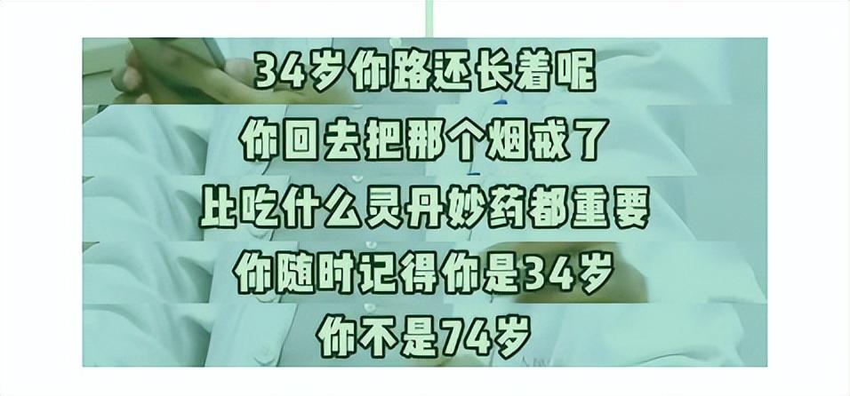之后李医生又苦口婆心反复劝说:“你记住你是34岁,不是74岁,你把烟戒了,比吃什么灵丹妙药都重要。”