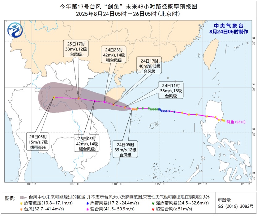 大风预报:8月24日08时至25日08时,南海大部、西沙群岛和中沙群岛附近海域、北部湾、琼州海峡、海南岛及沿海、广西沿海、广东中西部沿海将有6-8级大风,其中南海西北部和中西部及西沙群岛部分海域、北部湾中部和南海海域、海南岛沿海的风力有9-11级,“剑鱼”中心经过的附近海域或地区的风力可达12-14级、阵风15-16级。