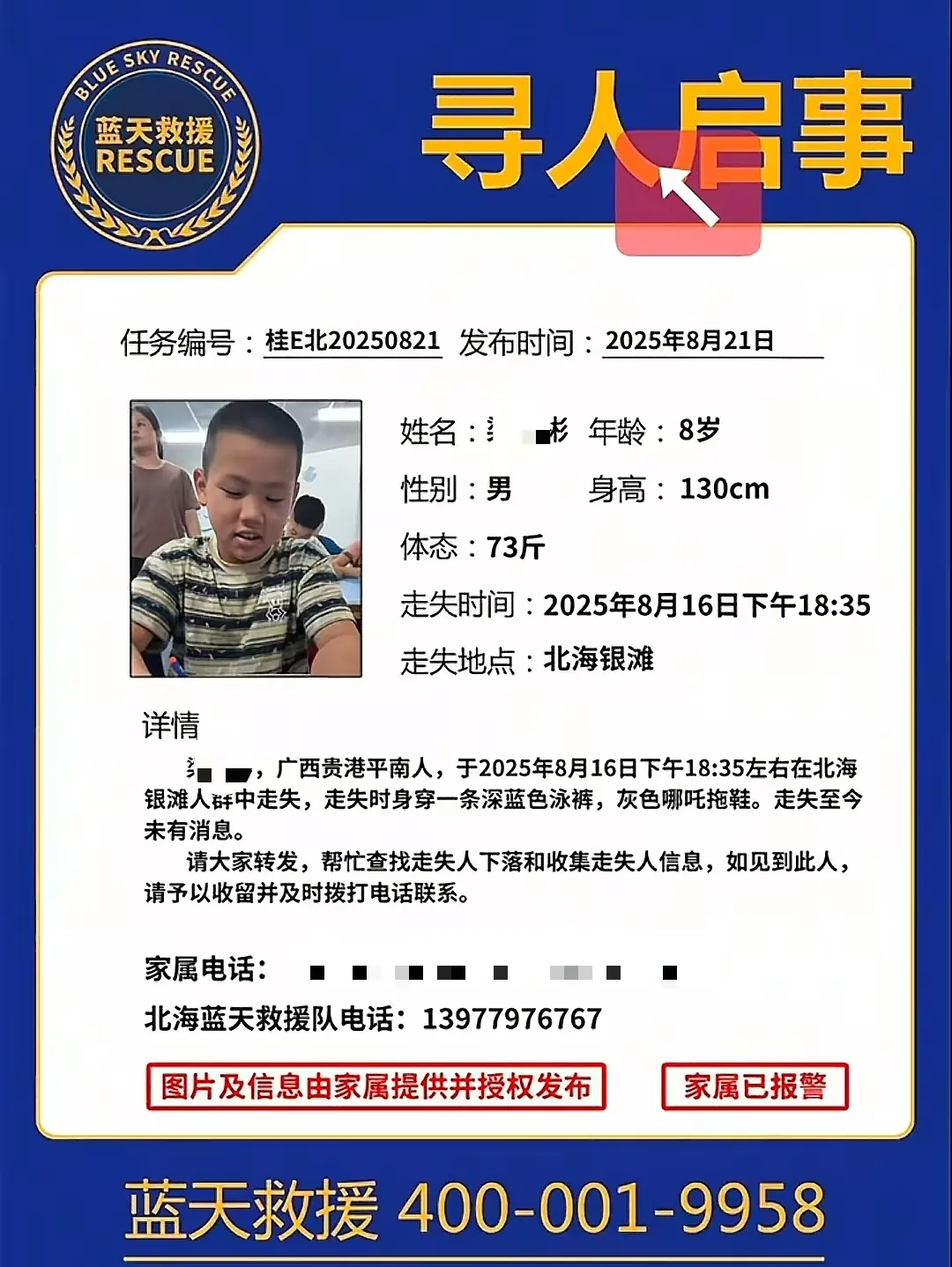 近日,广西北海市银滩景区一名8岁男孩失联多日的消息引发关注。