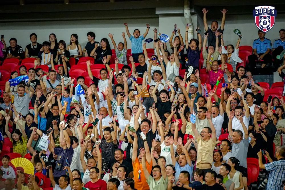 现场观众庆祝“汉超”揭幕战进球。组委会供图