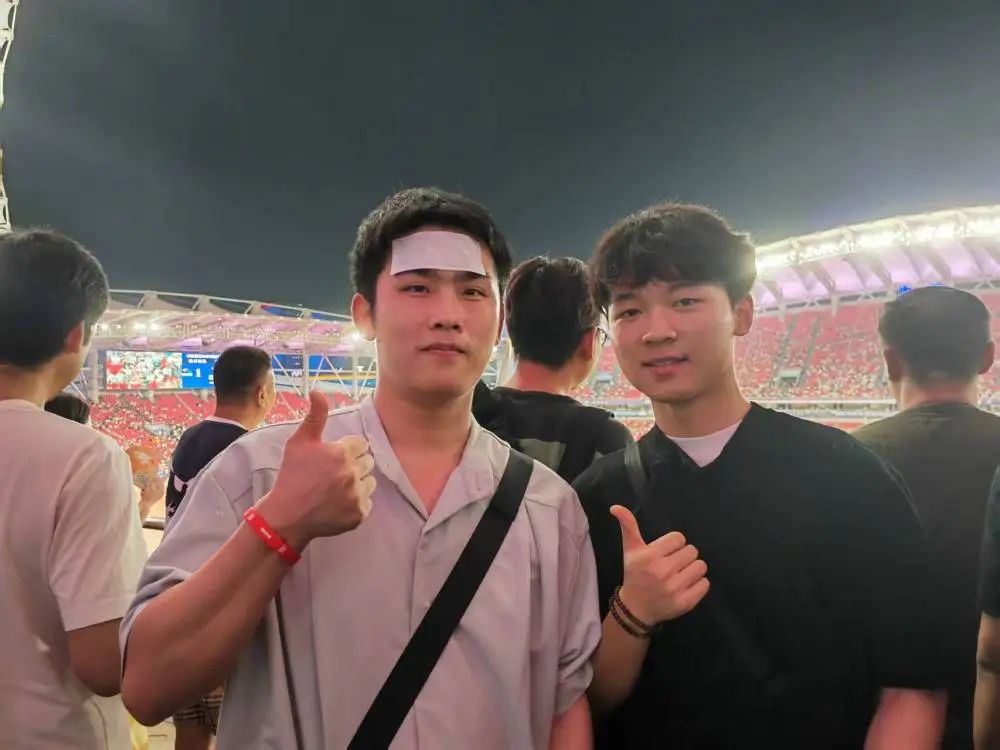 贴着退热贴观看“汉超”揭幕战的观众。新华社记者 乐文婉 摄