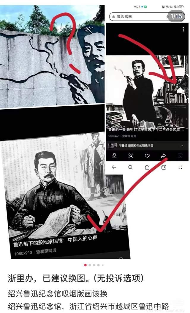 孙女士称自己是一名控烟志愿者,平时经常关注公共场所禁烟的话题,她投诉绍兴鲁迅纪念馆网红墙画的理由是,该画的原画是鲁迅在自己家里抽烟,墙画去掉背景,有引导人室外聚集抽烟危害他人健康的风险,还有误导之嫌,要求对墙画进行更换。