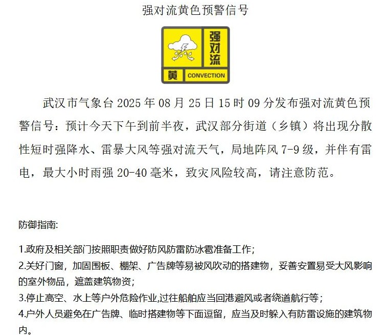 长江日报大武汉客户端8月25日讯25日15时9分,武汉市气象台发布强对流黄色预警信号:当晚,武汉部分街道(乡镇)将出现分散性短时强降水、雷暴大风等强对流天气,局地阵风7~9级,并伴有雷电,致灾风险较高。