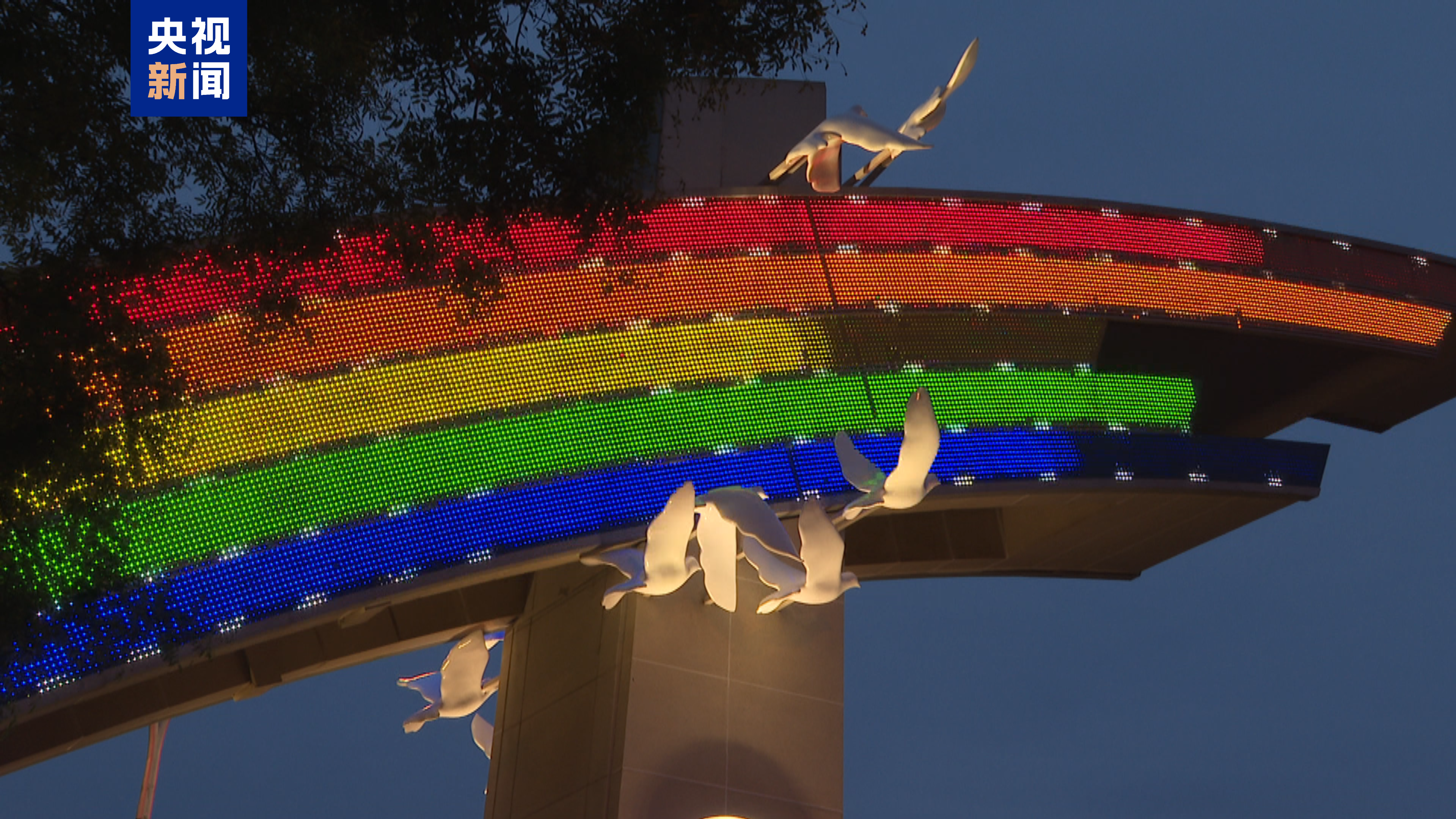 在建国门、复兴门两处彩虹门设置了纪念主题景观。14只鸽子翱翔彩虹穹顶,象征光明前景,立柱布置纪念活动标识,彰显仪式的庄严庄重,夜间彩虹门光影沿长安街贯通,展现从和平走向复兴的民族征程。