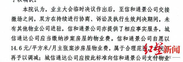 红星新闻记者在判决书中看到,一审法院认为,信和通景物业并非最高院物业司法解释中规定的“未提供物业服务”之情形,业主大会作出临时决议后,到物业公司与业委会完成交接前,这段时间一直处于双方协商、诉讼及判决执行过程中,应视为信和通景公司在此期间仍在为小区提供事实上的物业服务,因此业主应当缴纳截至物业公司与业委会实际交接之日的物业费。