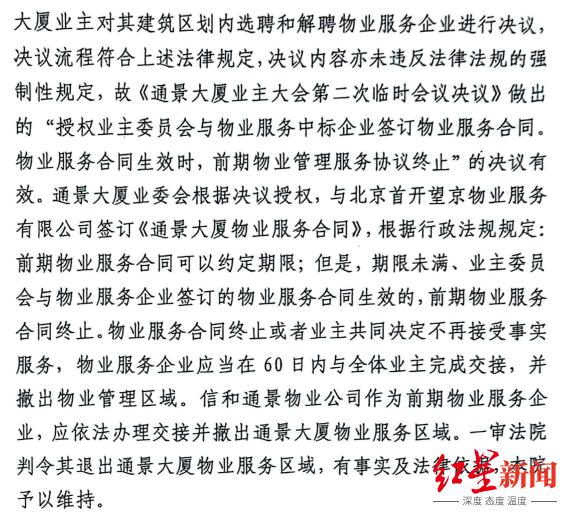 红星新闻记者在北京市第一中级人民法院2020年9月作出的二审判决中看到,法院认定业主更换物业的决议有效,信和通景物业应依法办理交接并撤出通景大厦物业服务区域,维持一审法院判令其退出物业服务区域的决定。
