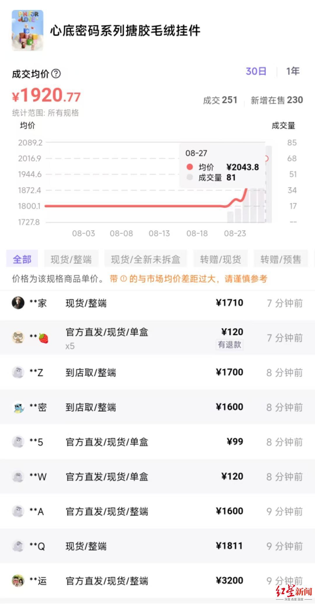 在开售之前,二手平台已有多个卖家对迷你LABUBU开出二至三倍的价格。开售之后一小时内,转手价格飙升,原价1106元的整端迷你LABUBU(14个)二手价达到1500元至3200元。