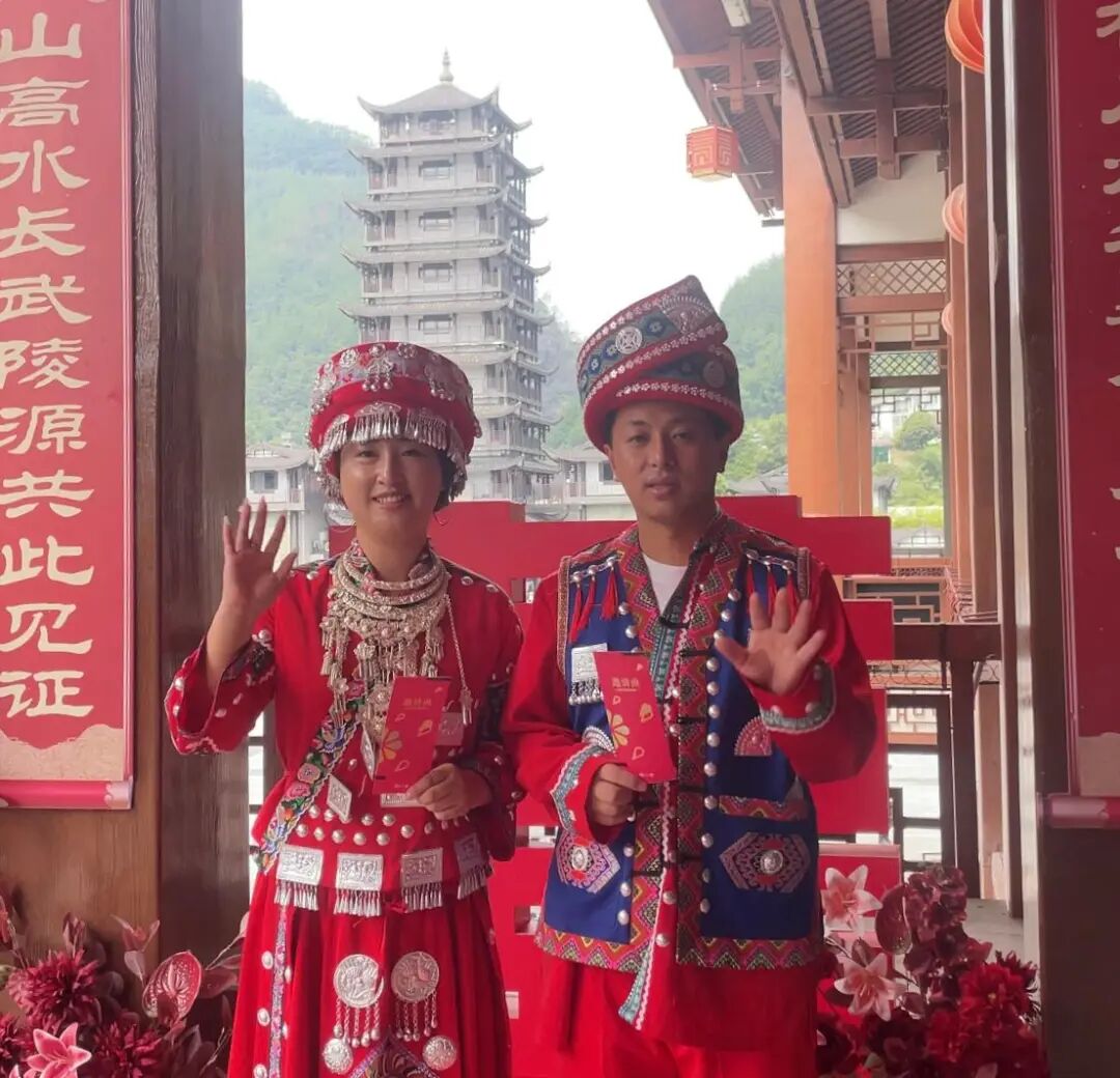 “今天不光是七夕节,同时也是我们两个人的生日,非常有意义的一天!”王女士幸福地说。她表示,她和温先生是来张家界旅游的。因为恰逢七夕,又是两人共同的生日,于是决定干脆“就地领证”。两人在当地租了一套喜庆的土家族服饰,拍了甜蜜合影。更让王女士惊喜的是,当地还赠送了他们两张峰林音乐节邀请函。“太惊喜了,还有我喜欢的陈楚生!”