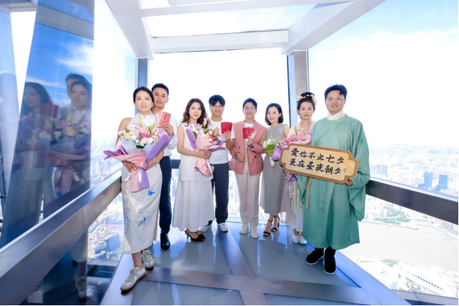 七夕当天,上海中心特色婚姻登记点正式启用。首批20对新人在“中国第一高楼”上海中心大厦的52楼,以苍穹为幕、浦江为证,许下相伴一生的诺言,完成了极具特色的云端婚姻登记,拍摄云端纪念照,携手制作寓意美好的珍珠画,还打卡了“空中魔盒”及观光厅等特色点位,于城市之巅记录幸福时刻。