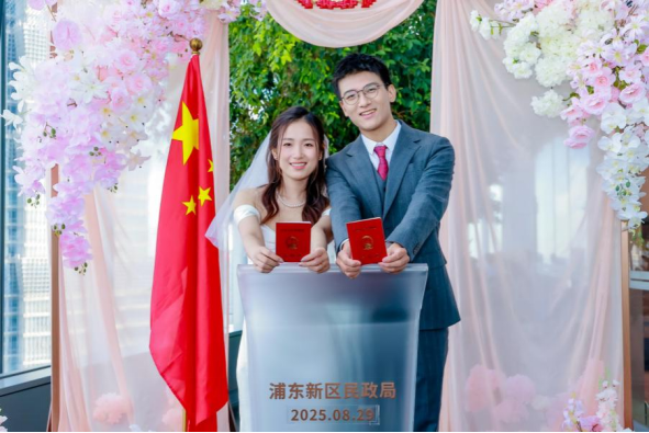 2025年8月29日,上海浦东,一对新人领取结婚证后合影。本文图均为 上海民政微信公众号 图