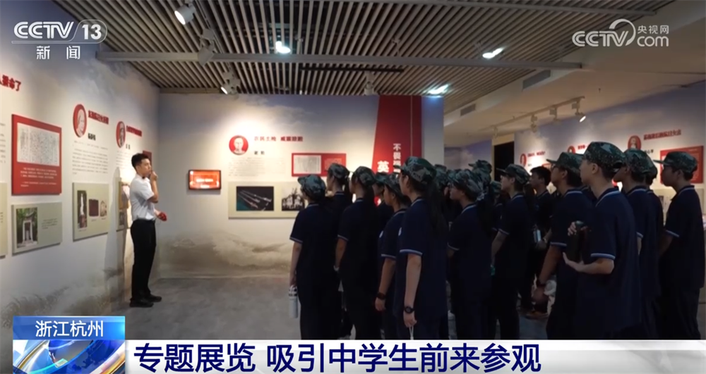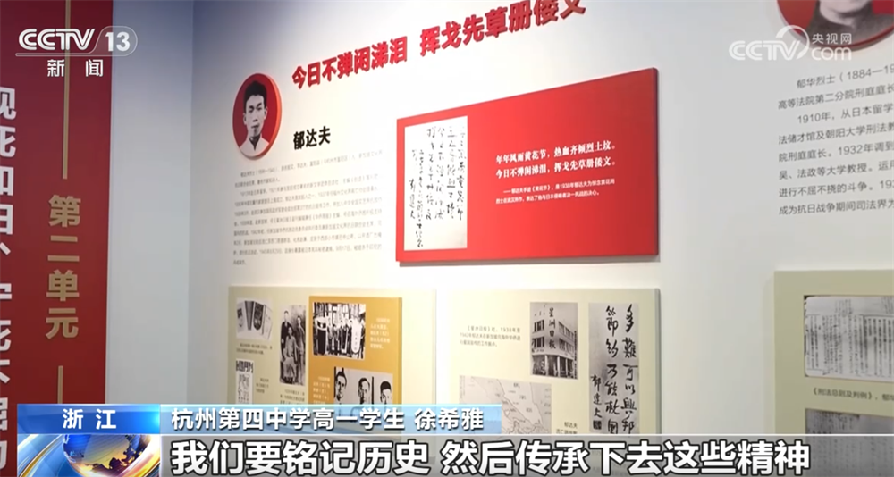 在浙江杭州的浙江革命烈士纪念馆二楼展厅,高中生们正在参观《抗战长歌—浙江著名抗日英烈颂》专题展览,展览通过近200张图片、72个视频,展示了刘英、朱程、郁达夫等20多位浙江著名抗日英烈和多个抗战烈士群体的英雄事迹。