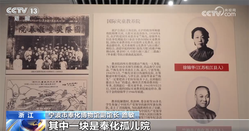 浙江宁波奉化博物馆副馆长路敏称:“我身后这个区域展示的是奉化地方在抗战期间自发组织的一些慈善组织,其中一块是奉化孤儿院,另外一块是国际灾童教养院。这两块组织在抗战期间旨在保护、收养抗战期间的难童孤儿,其中的国际灾童教养院的一些学生后期还参加了新四军抗战训练。”