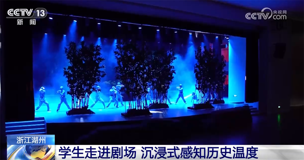 而在湖州市长兴县,一百多名学生走进剧场观看红色舞台剧《竹海惊雷》。舞台剧以 “新四军苏浙皖军区抗战”等真实事件为基础,从模拟空袭的特效到竹林战场的实景化布置,让观众在沉浸式观演与体验中触摸历史温度、传承抗战精神。