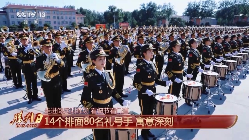 本次联合军乐团在演奏队形的编排上,整体设置了14个排面,寓意14年抗战;前排设置了80名礼号手,寓意抗战胜利80周年。