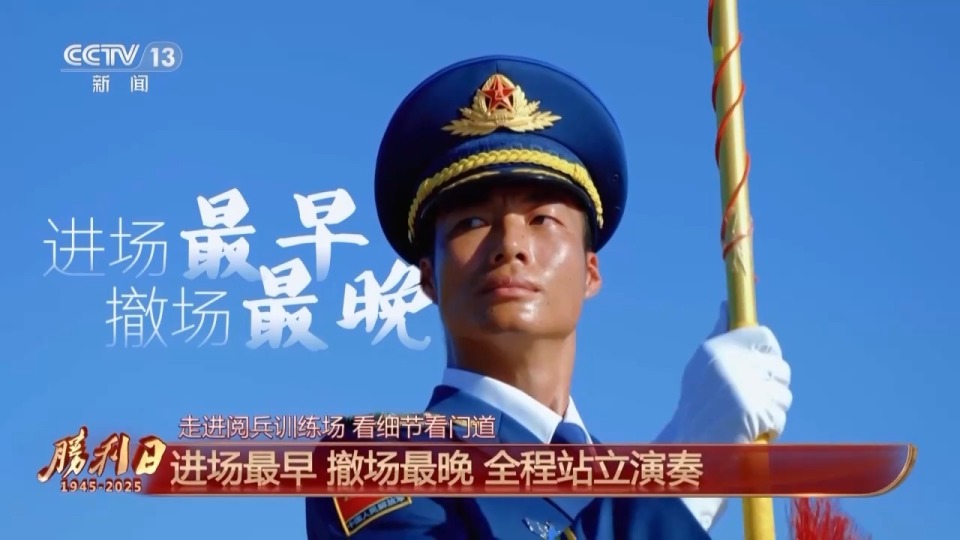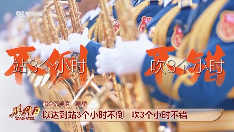 联合军乐团 周磊:我们日常每天6点10分,开始进行为期一小时的军姿训练,也会着重进行军姿持乐器训练,以及军姿持乐器演奏训练,以达到站3个小时不倒,吹3个小时不错。