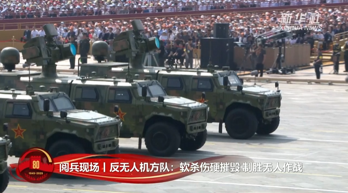 这个方队受阅的反无弹炮系统、高能激光武器、高功率微波武器等成体系建设,可拦截无人机、巡飞弹等目标,既能软杀伤,又能硬摧毁,是反制无人机的强大“铁三角”。