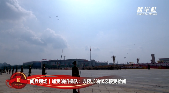 新华社北京9月3日电(记者刘济美、张瑞杰、米思源)9月3日上午,运油-20A与轰-6N、歼-16、歼-20飞机组成加受油机梯队,以预加油状态飞过天安门广场上空,接受祖国和人民检阅。