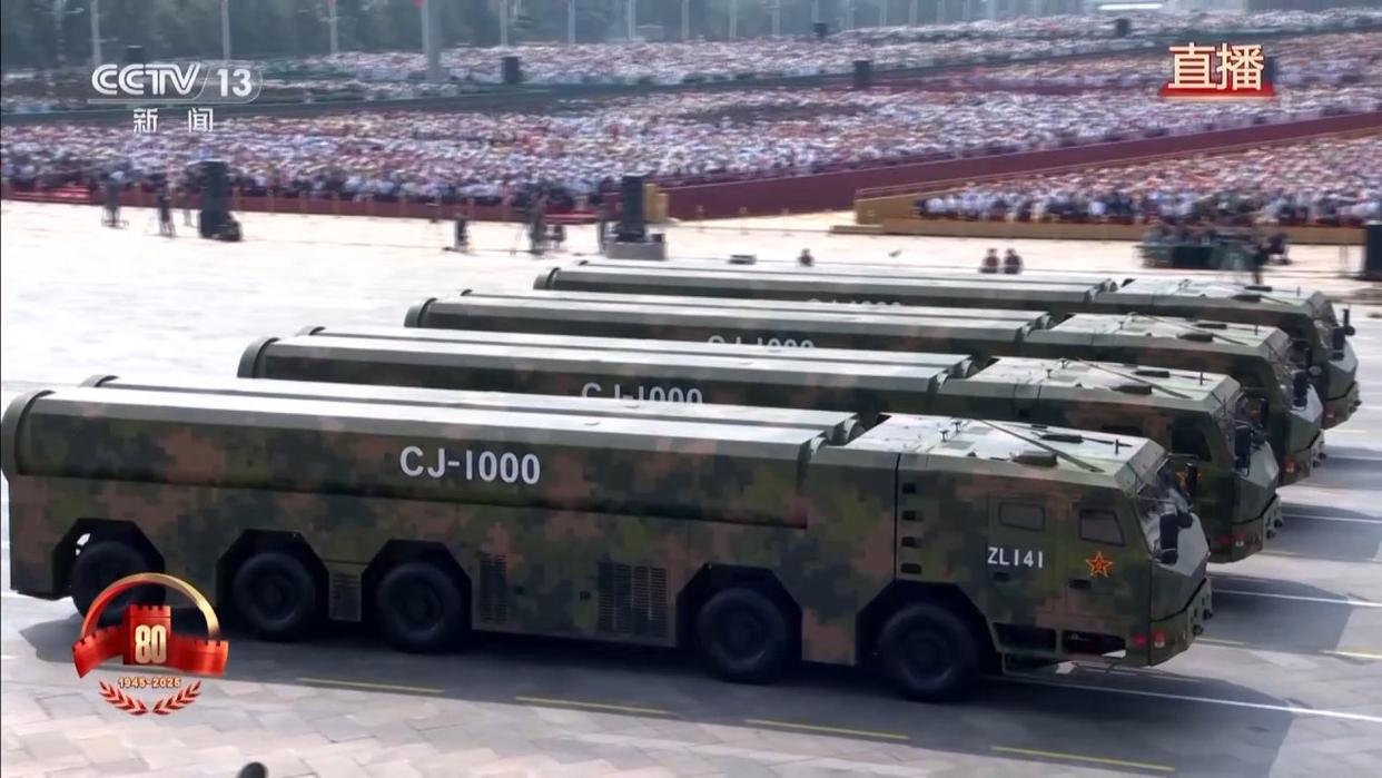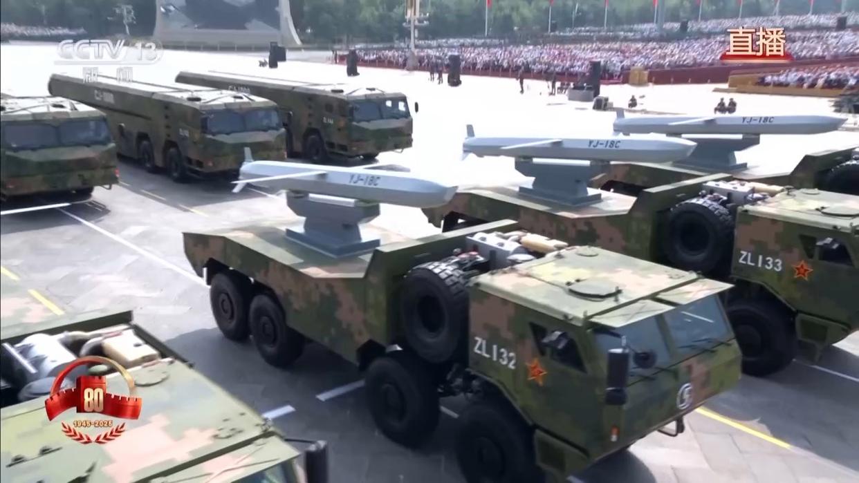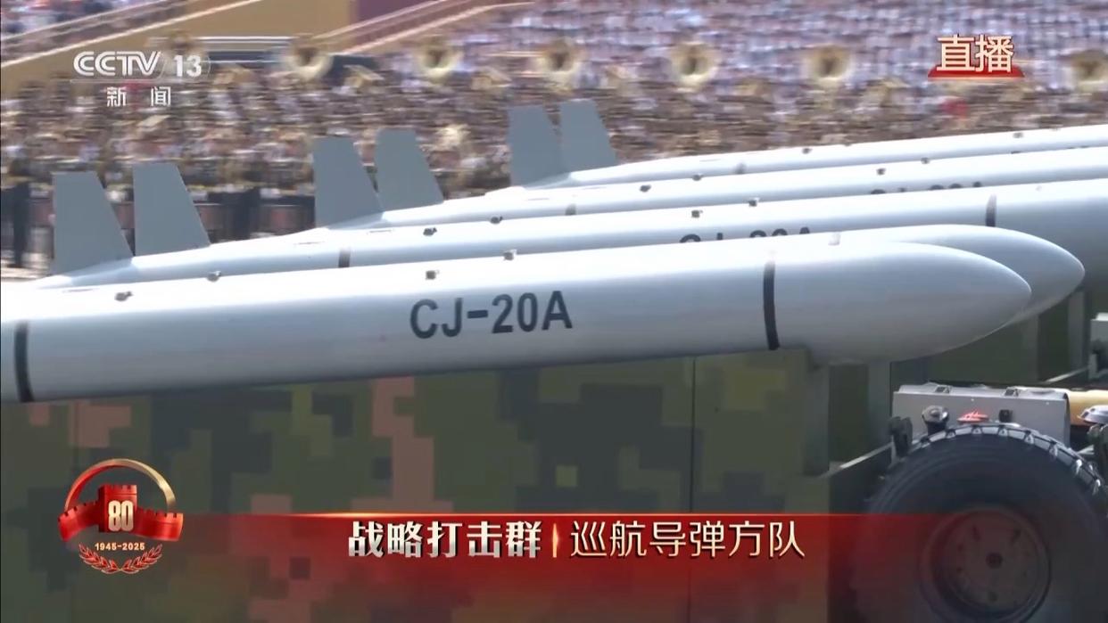 长缨在手,敢缚苍龙。巡航导弹方队采取海军、空军、火箭军联合编组模式,受阅的长剑-20A、鹰击-18C、长剑-1000导弹,是实施远程精确打击、多域慑战制胜的“点穴”利器。
