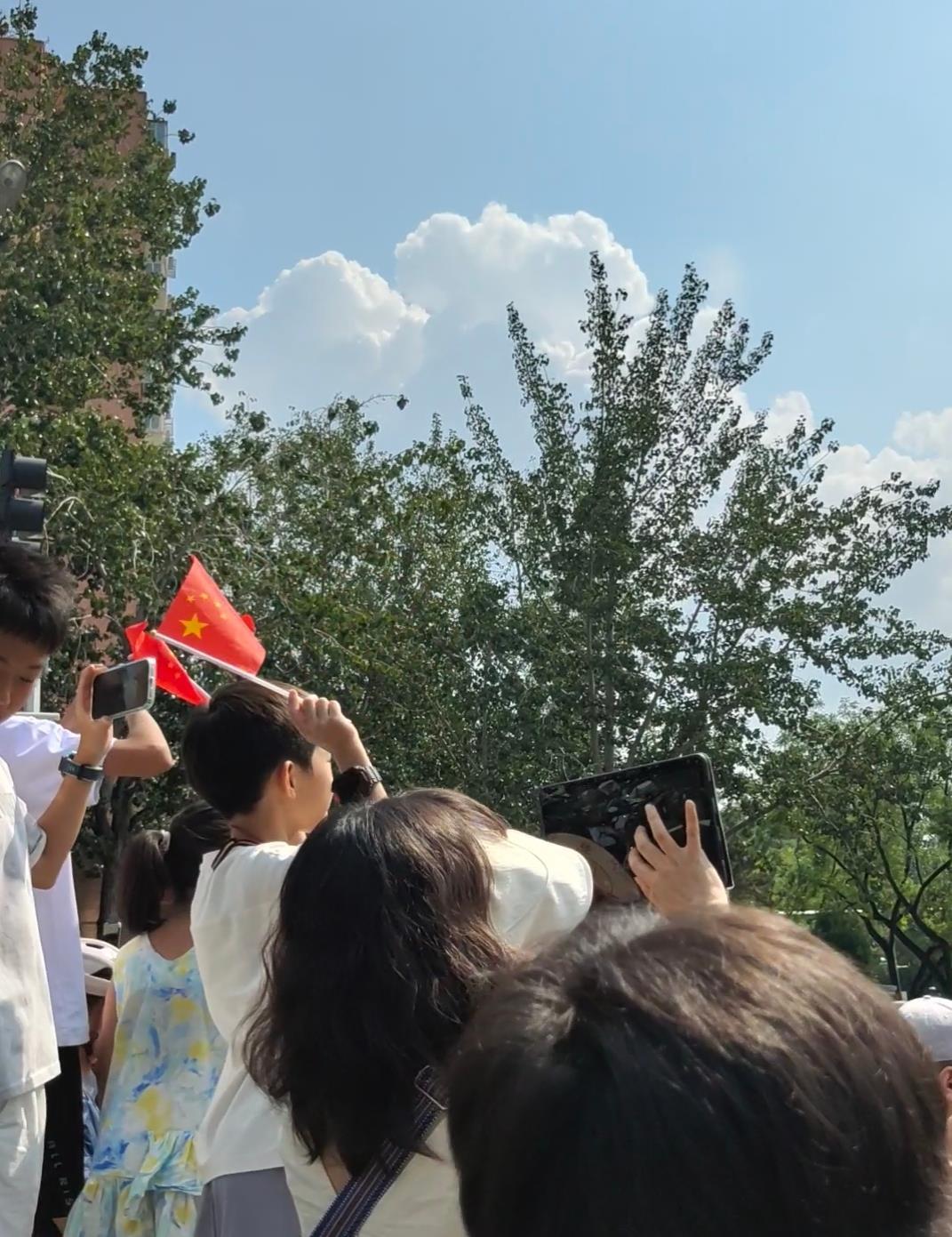 “我要等着看坦克!”有系着红领巾的小朋友喊道。