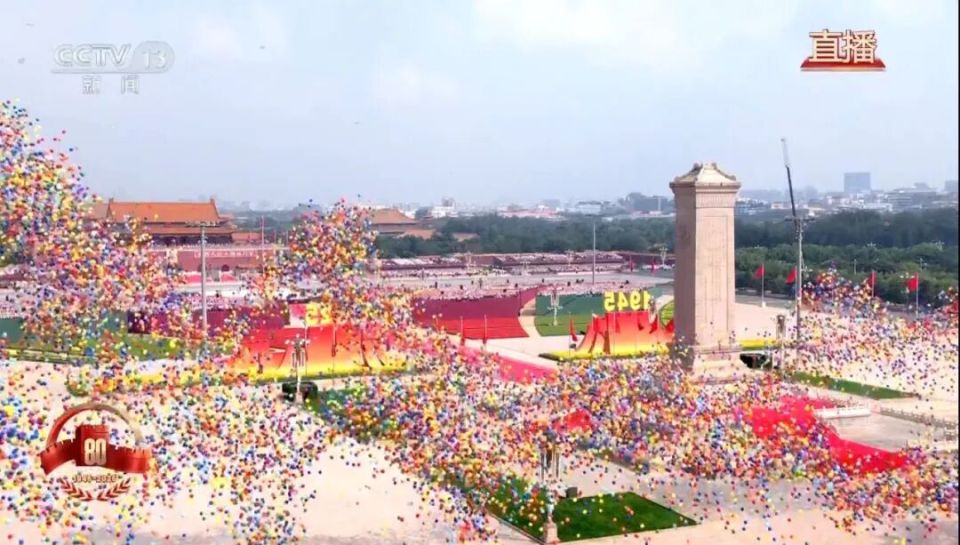 9月3日上午,阅兵活动结束后,《歌唱祖国》响彻天安门广场上空,全场热血沸腾。鸽笼开启,8万羽和平鸽展翅高飞,礼赞和平;8万只气球腾空而起,色彩缤纷。