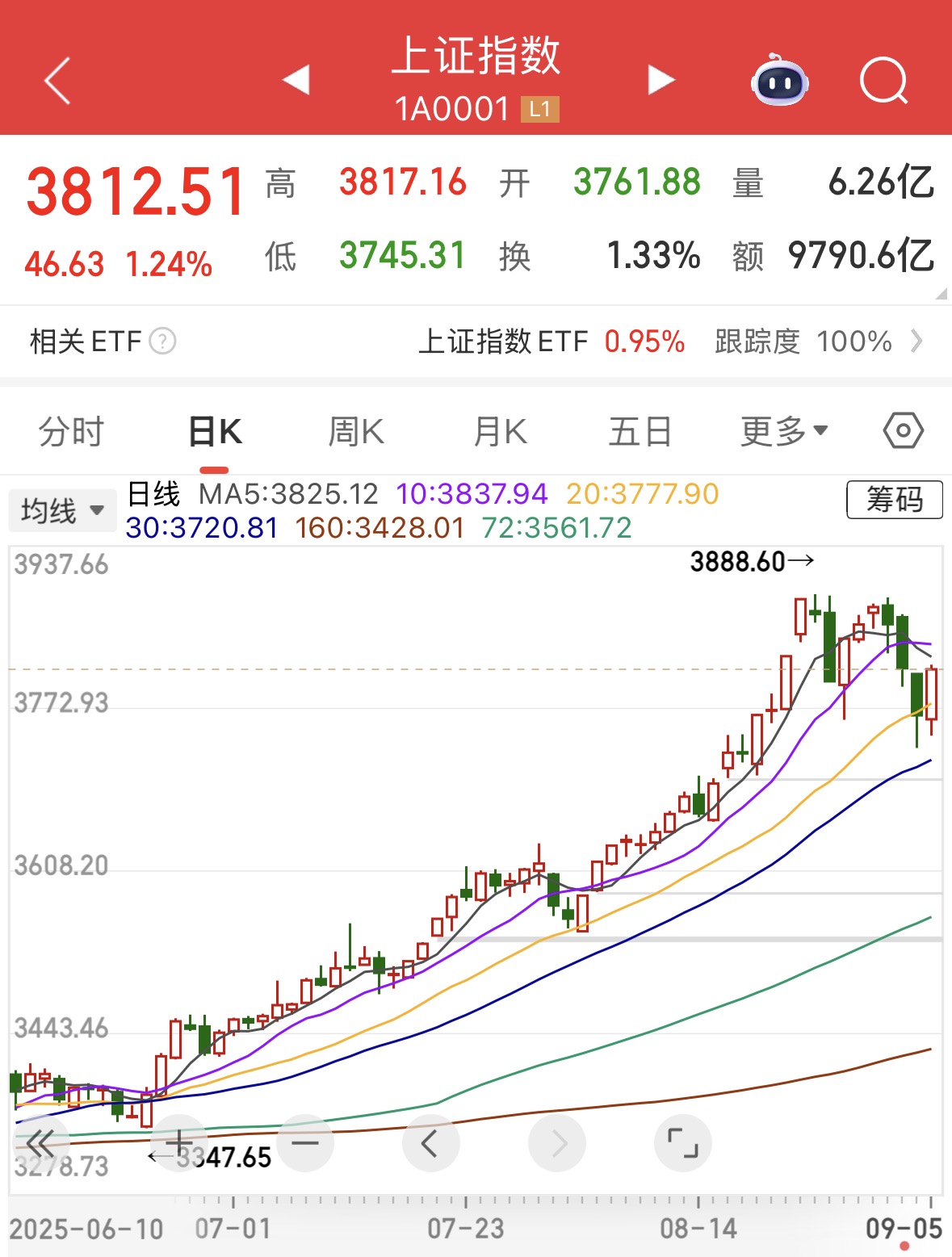 9月5日,A股三大指数集体大涨。截止收盘,沪指涨1.24%,收报3812.51点;深证成指涨3.89%,收报12590.56点;创业板指涨6.55%,收报2958.18点。