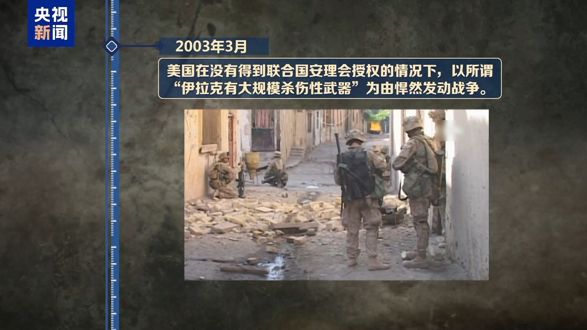 2003年3月,美国在没有得到联合国安理会授权的情况下,以所谓“伊拉克有大规模杀伤性武器”为由悍然发动战争。以美军为首的联军肆意射杀、关押、虐待无辜平民,无差别轰炸居民区,甚至大量使用白磷弹、贫铀弹。到2011年12月美军战斗部队全部撤离,伊拉克战争导致约20万至25万平民死亡。