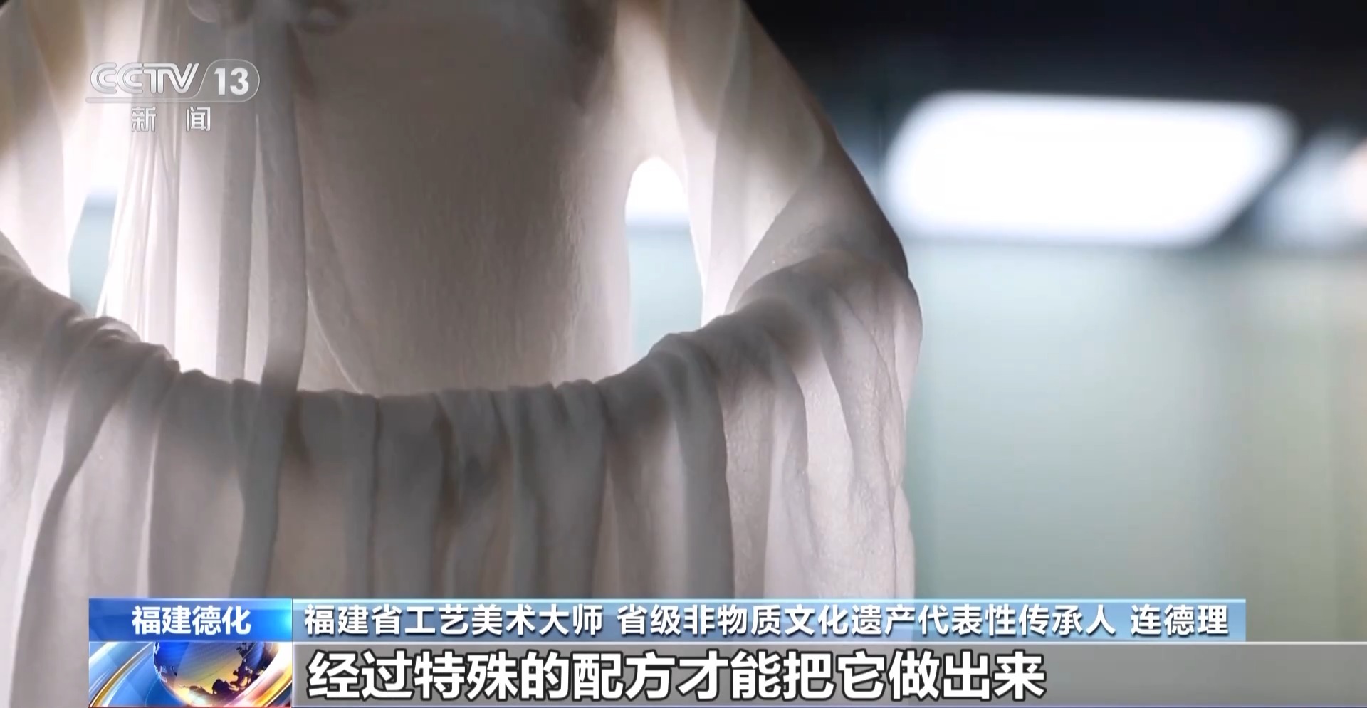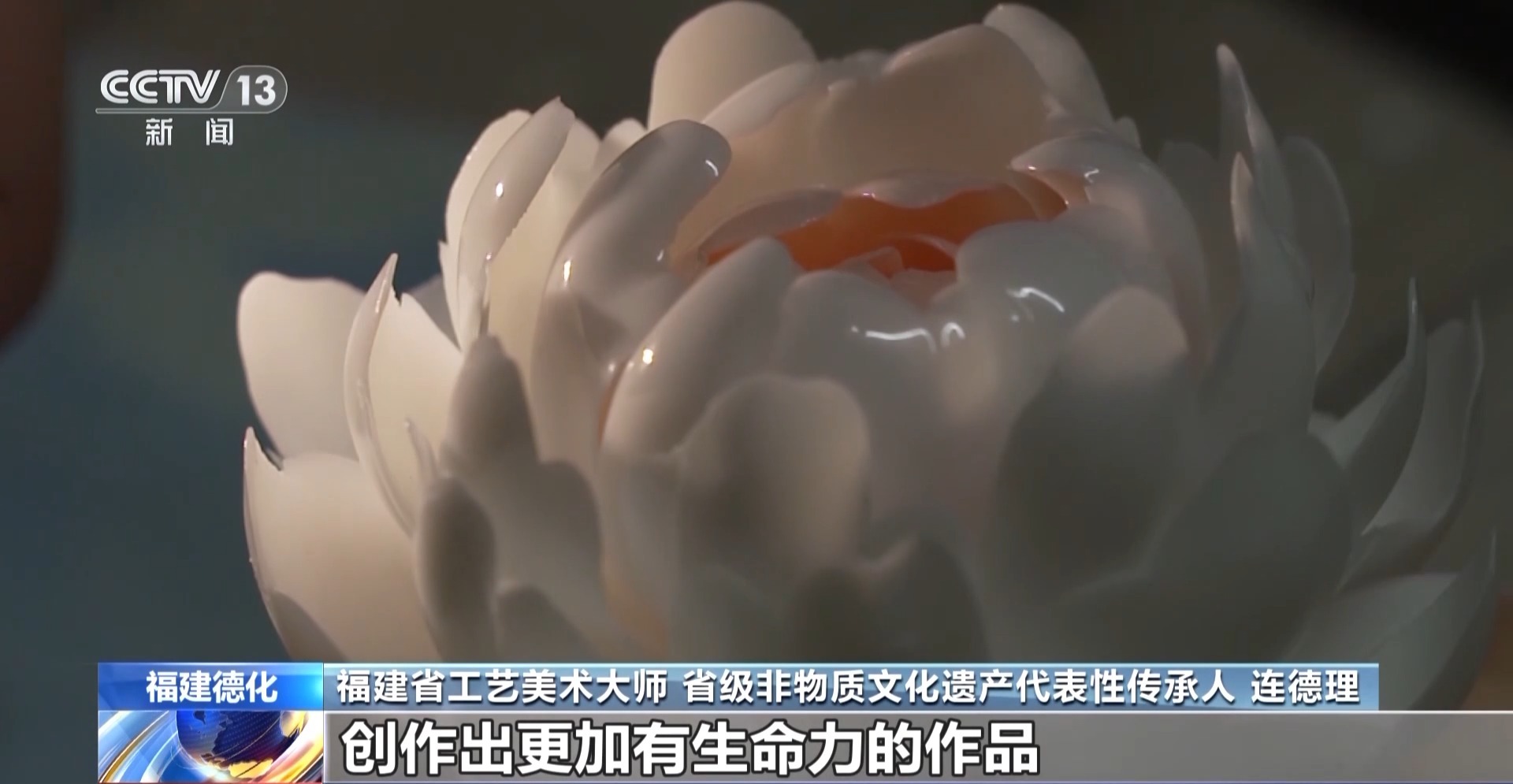 福建省工艺美术大师 省级非物质文化遗产代表性传承人 连德理:我叫连德理,出生在世界瓷都德化,从事陶瓷行业30多年。德化白瓷素来以白如玉、明如镜、薄如纸、声如磬闻名世界。传统技艺的支撑,加入现代的审美,创作出来的作品,更有生命力更有活力。通过作品《神话》,很多人认识了我。她穿着一件漂亮的瓷衣,厚度0.2毫米,远看是纱,近看是瓷,非常生动。