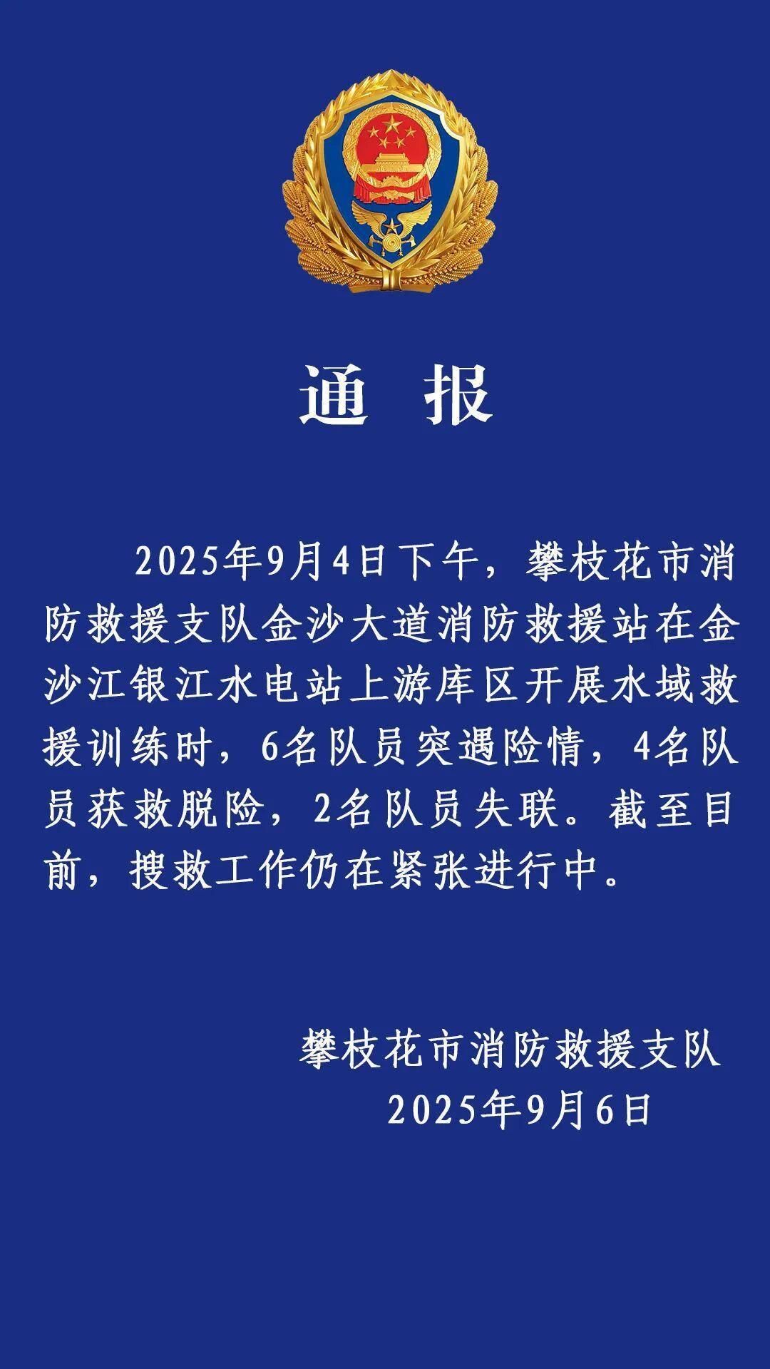据攀枝花消防通报,9月4日下午,攀枝花市消防救援支队金沙大道消防救援站在金沙江银江水电站上游库区开展水域救援训练时,6名队员突遇险情,4名队员获救脱险,2名队员失联。截至7日上午10时,已经是两名消防员失联的第三天,极目新闻记者从攀枝花多部门获悉,目前仍在搜救当中。