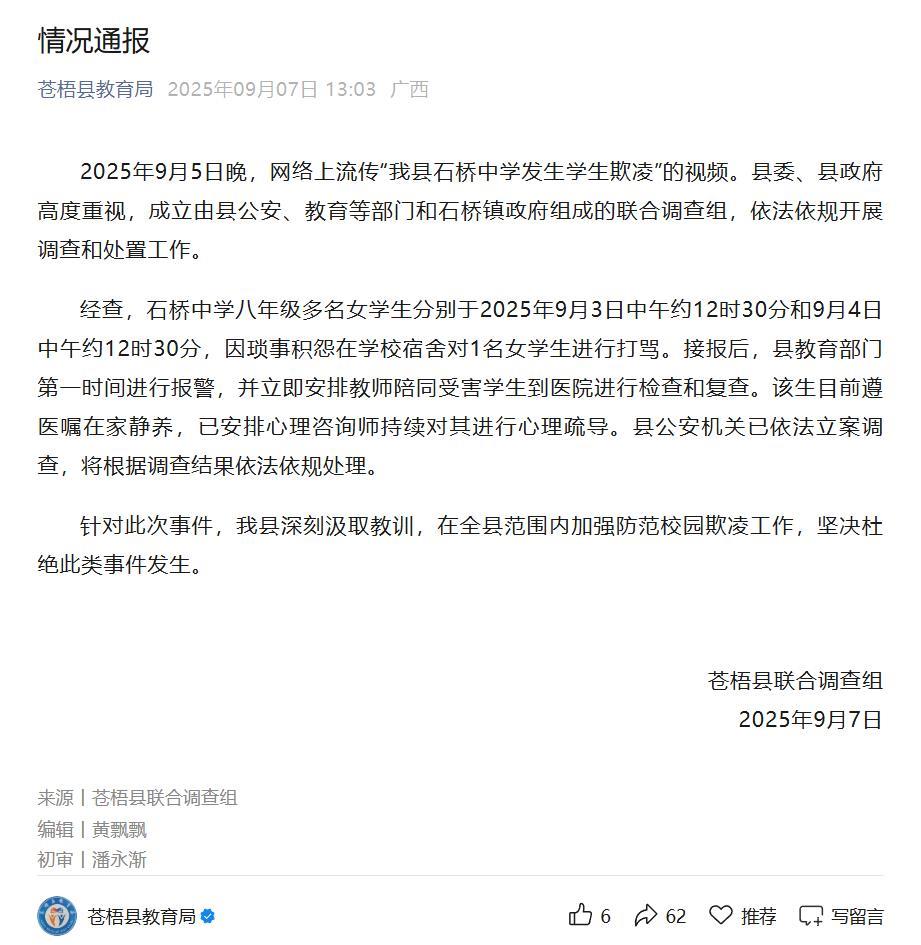 9月7日13时许,苍梧县教育局发布情况通报:“经查,石桥中学八年级多名女学生分别于2025年9月3日中午约12时30分和9月4日中午约12时30分,因琐事积怨在学校宿舍对1名女学生进行打骂。接报后,县教育部门第一时间进行报警,并立即安排教师陪同受害学生到医院进行检查和复查。该生目前遵医嘱在家静养,已安排心理咨询师持续对其进行心理疏导。县公安机关已依法立案调查,将根据调查结果依法依规处理。”