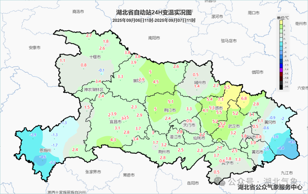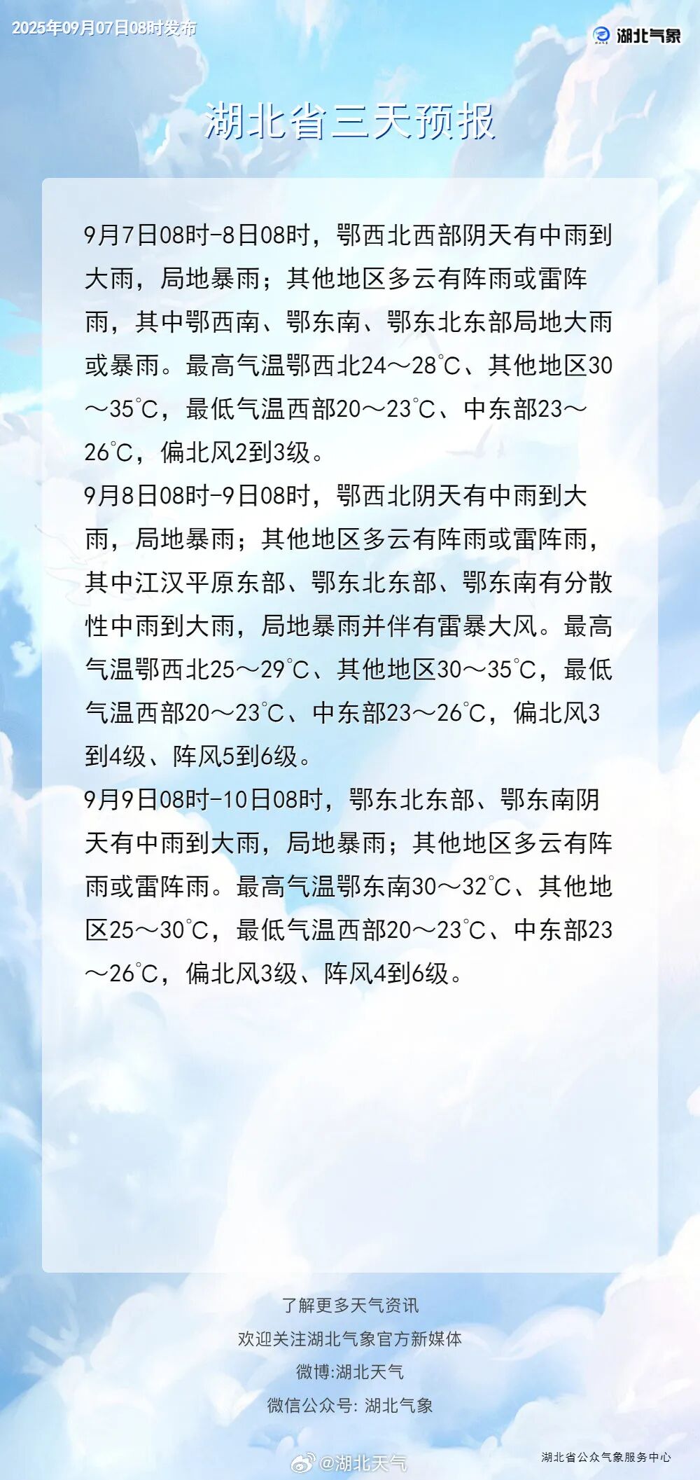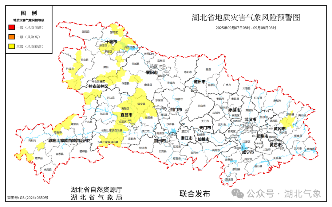 2025年09月07日08时-2025年09月08日08时,预计三峡库区(巴东县北部、夷陵区大部),神农架林区西南部和东北部、十堰(茅箭区、张湾区、十堰经济技术开发区、郧阳区北部、竹溪县东部和南部、竹山县中西部和南部、房县东北部和南部、丹江口市北部、中部和南部)、襄阳(保康县西北部和东北部、南漳县西部)、宜昌(西陵区、点军区、伍家岗区、远安县、当阳市北部和西部、长阳土家族自治县中部和东部、五峰土家族自治县中部)、恩施(恩施市北部、建始县西北部、利川市南部、咸丰县西部)、黄冈(罗田县南部、浠水县北部)以及其他强降水区域发生崩塌、滑坡、泥石流的风险较高。请加强防范!